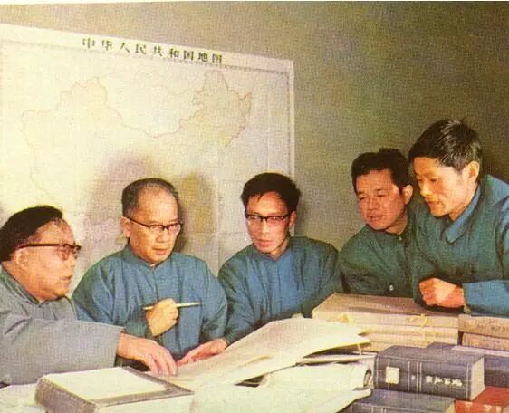 1970年代后期,谭其骧与研究室同事研究中国历史地理,自左向右分别是吴应寿、谭其骧、邹逸麟、王文楚、周维衍。