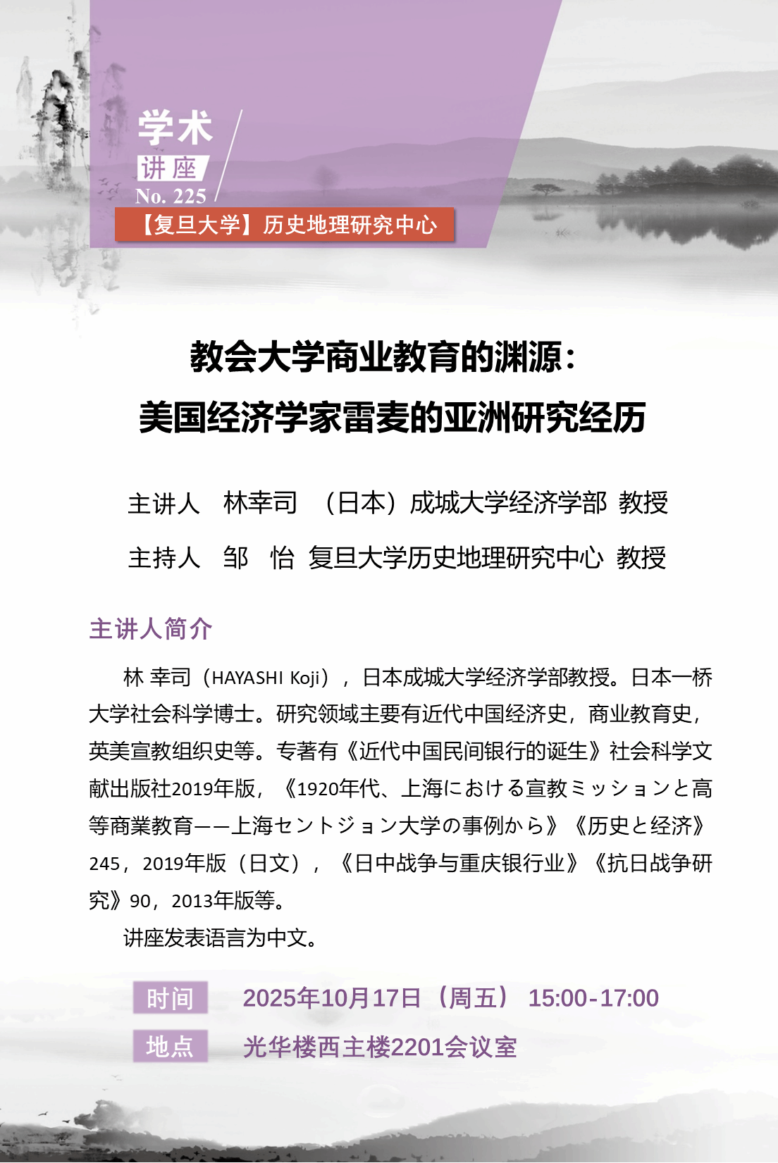 历史地理研究中心讲座(225):教会大学商业教育的渊源:美国经济学家雷麦的亚洲研究经历-复旦大学历史地理研究中心